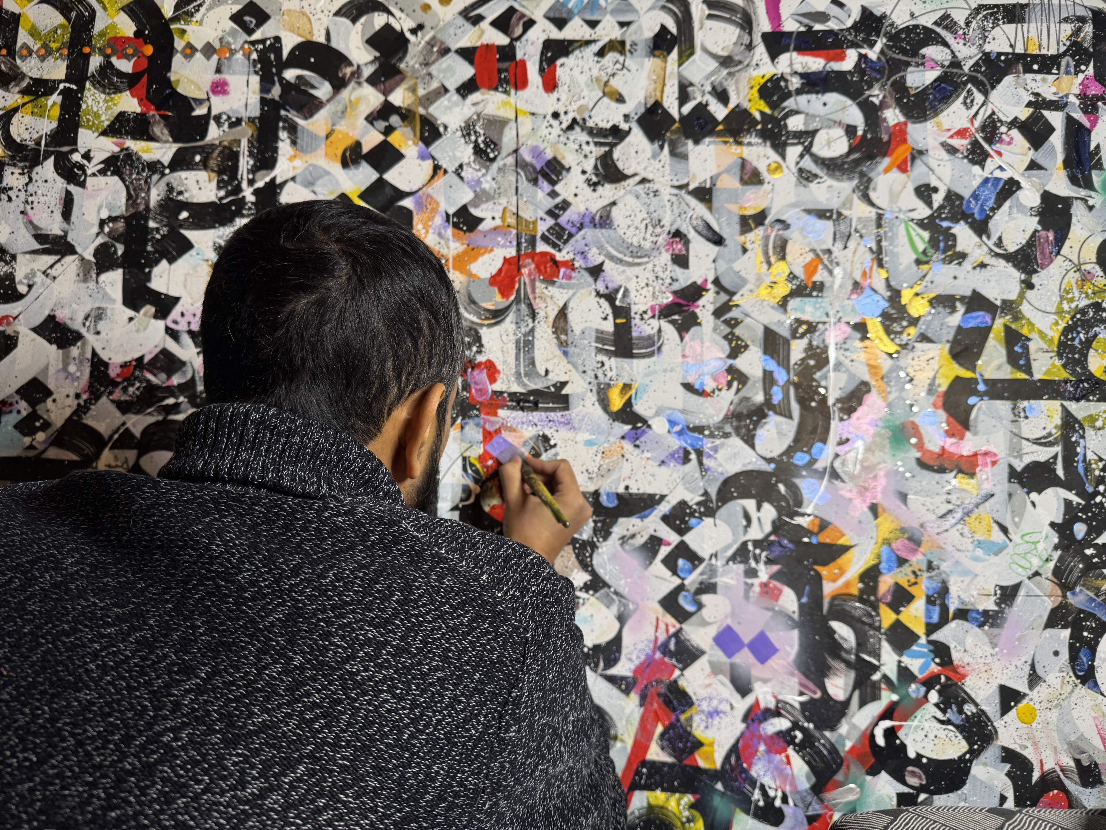 Zaman’s work solidified over a decade ago around an affirmation of life. Layered compositions rooted in public engagement, Calligraffiti, tensions between language, legibility, and meaning in sprawling English, Bengali, and Arabic, inviting viewers to “read the illegible,” encouraging curiosity, mutual respect, and reflection despite the impossibility of fully understanding one another. Again and again, in moments when violence was carried out in the name of power, slaying innocents as collateral to a nation’s war against its own shadow, Zaman's work—insistent, undeniable—was to say there is beauty in the lives that we ignore, and humanity. That innate sense of the preciousness of life takes on new dimension now.